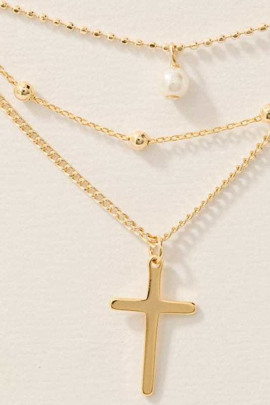 Mixed Layered Chains Cross And Pearl Charm Necklace