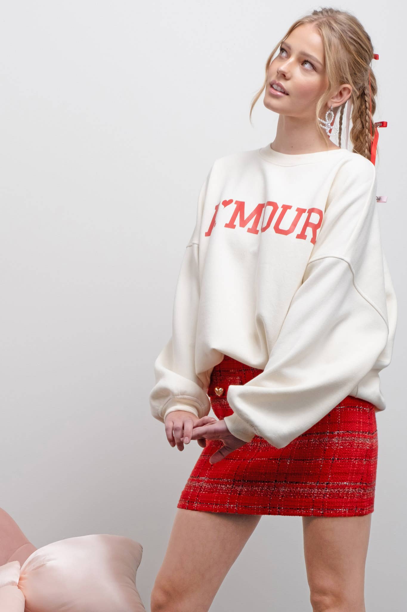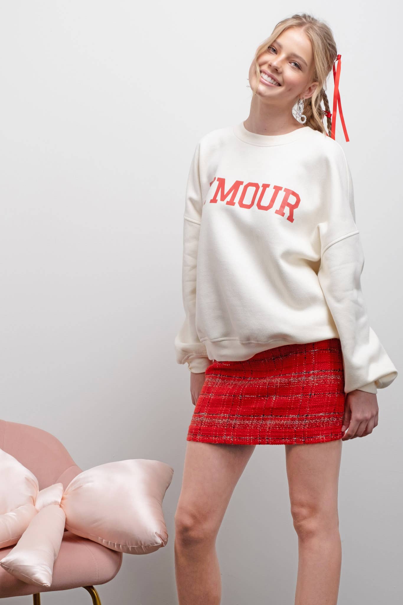 This knit sweatshirt features a crew neckline, long drop-shoulder sleeves with a relaxed, baggy fit, and is adorned with a graphic "Amour" text for a refined yet casual look.