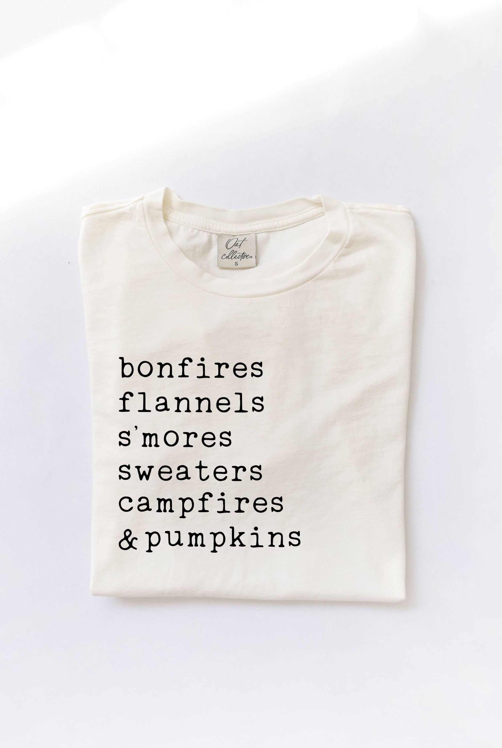 BONFIRES FLANNELS S'MORES SWEATERS CAMPFIRES & PUMPKINS Mineral Washed Graphic Top -100% Premium Cotton Jersey. -Relaxed unisex fit. -Screen Printed with water based ink. -All items are slightly different because of the dying process of the garment. -