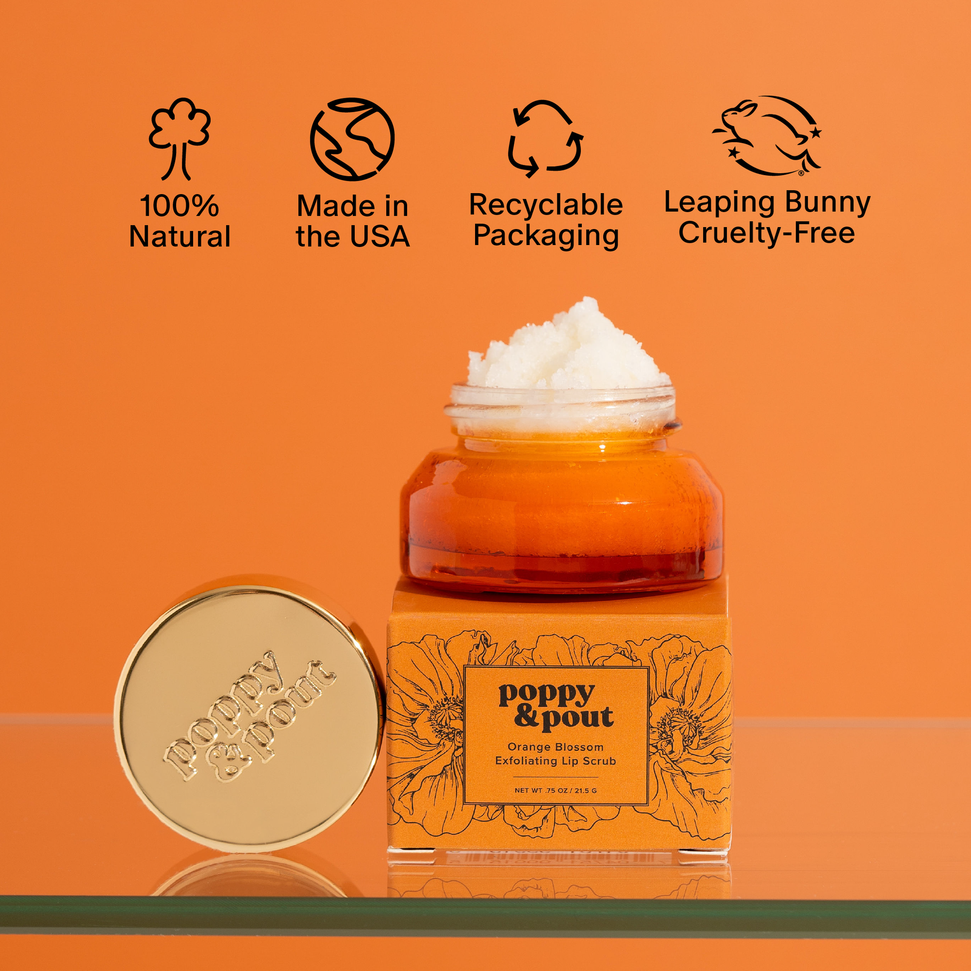 Our exfoliating lip scrub is the perfect way to prep your pout for smooth, hydrated lip balm application. We use a clean combination of natural ingredients to help clean and gently exfoliate your lips. Our Orange Blossom Lip Scrub tastes exactly like a delicious orange creamsicle!