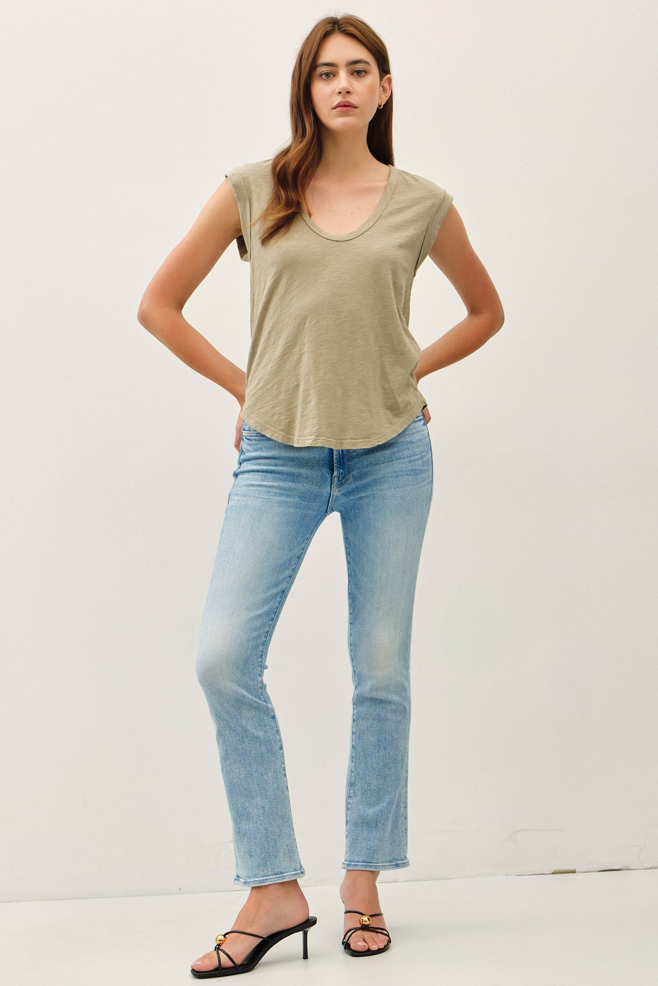 The Maye Top is an essential wardrobe staple featuring a scoop neckline and stylish cap sleeves with folded details. Crafted from soft cotton slub fabric and garment dyed for a refined look, this relaxed-fit tee offers a rounded hem and a distinctive center back seam, blending casual comfort.