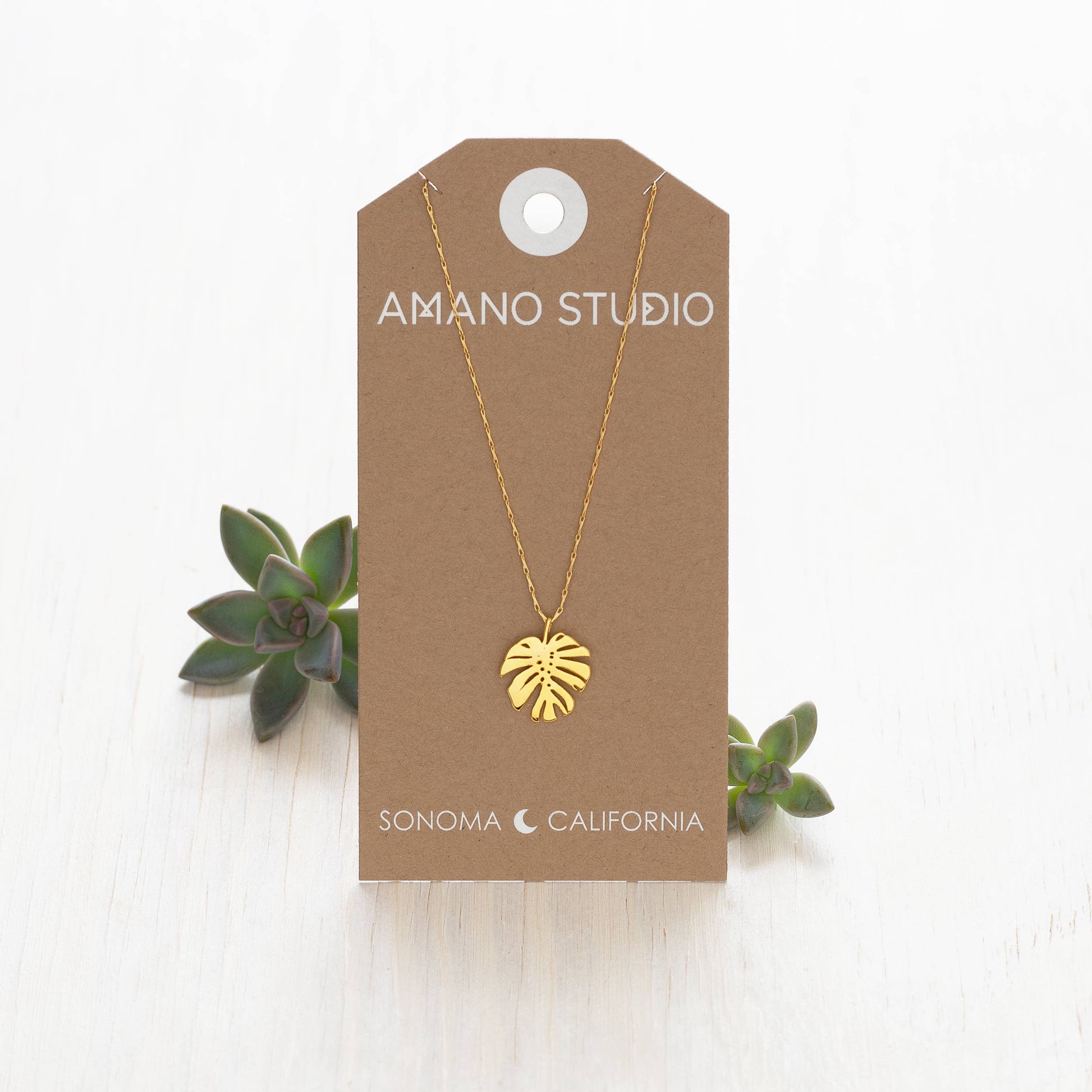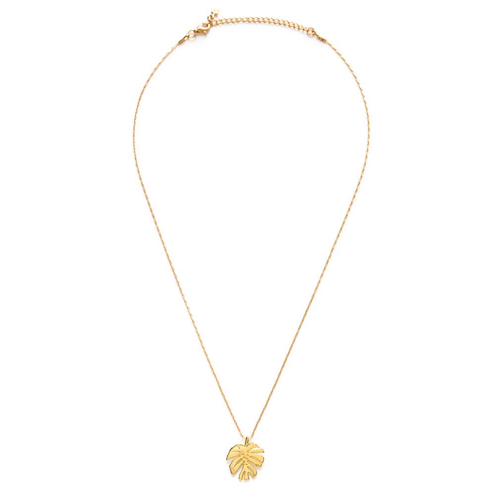The iconic monstera leaf makes a perfect pendant for plant lovers. The pendant measures .75" and hangs from a 16" chain with a 2" extender. 14k gold plated brass.