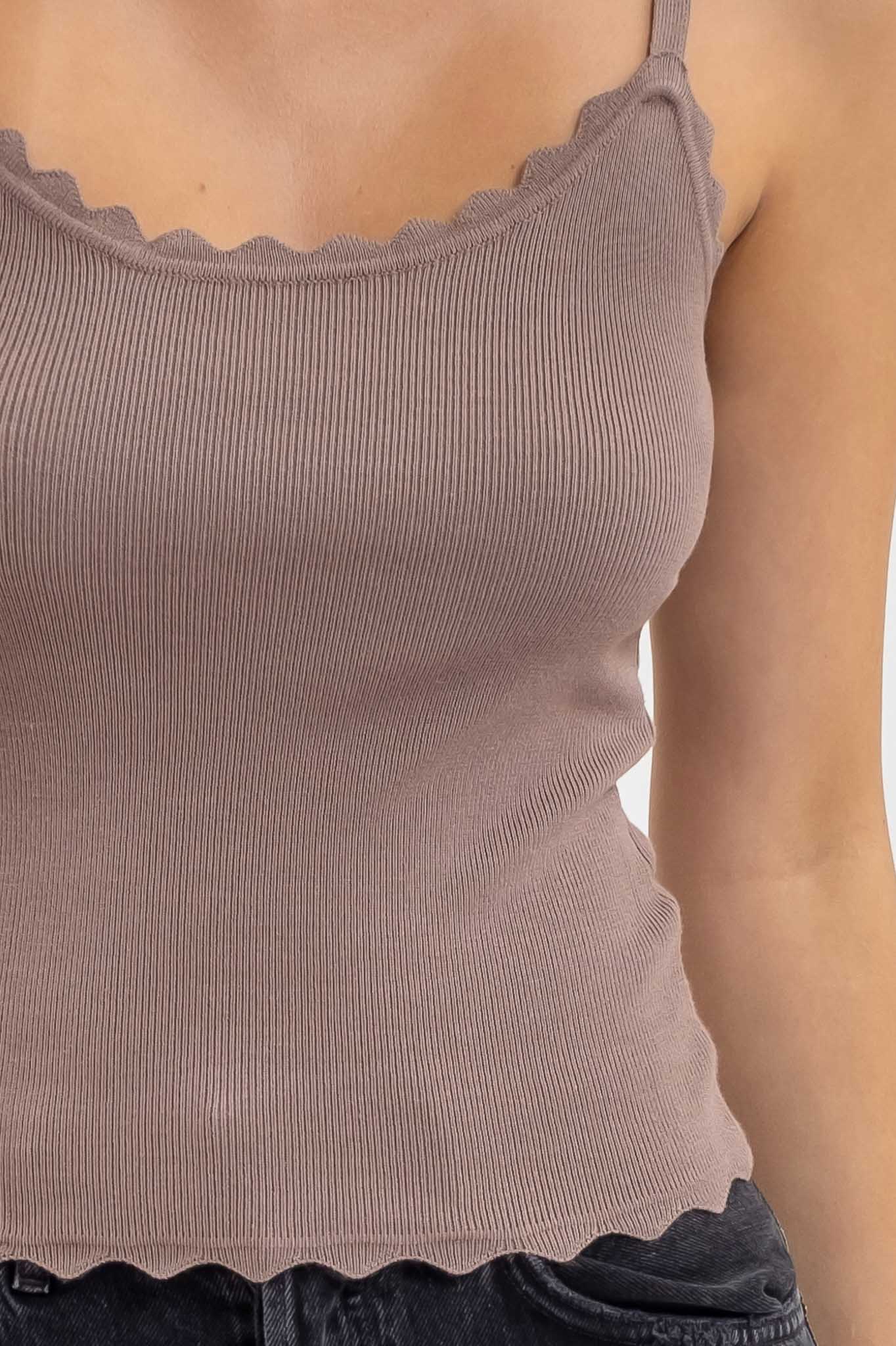 The flattering scoop neckline and delicate spaghetti straps create a refined silhouette, while charming scalloped detailing adds a touch of sophistication. Available in a clean solid color, this piece transitions seamlessly from layering essential to standalone statement—the perfect foundation for any wardrobe.